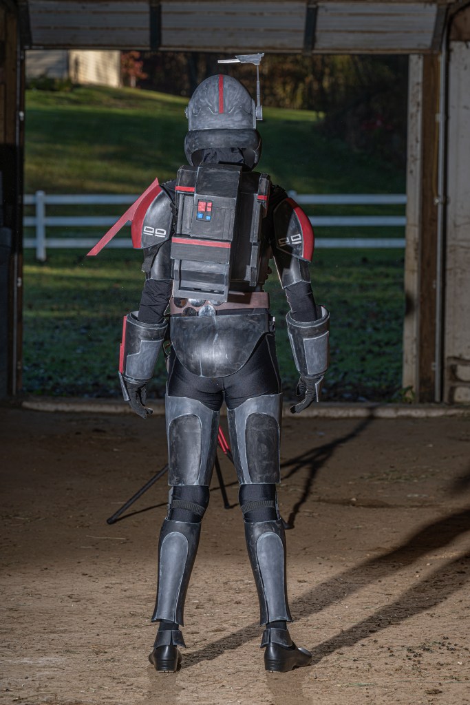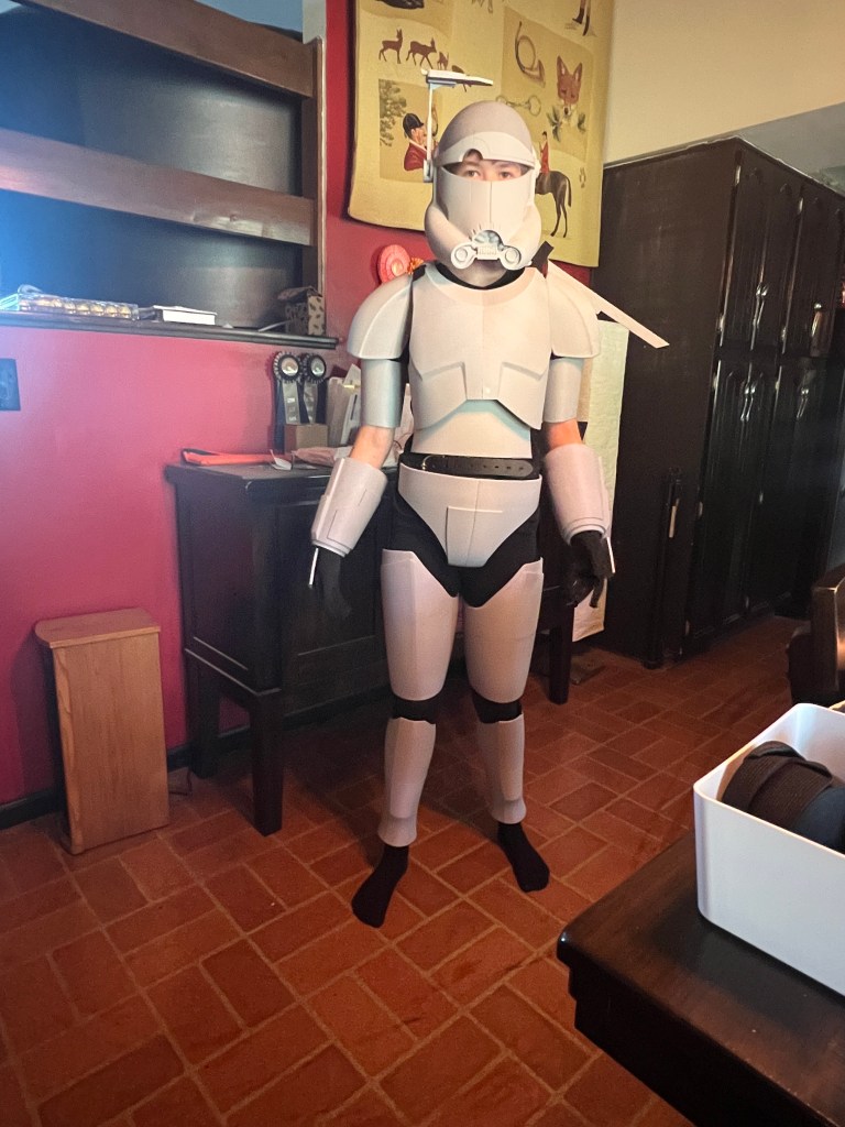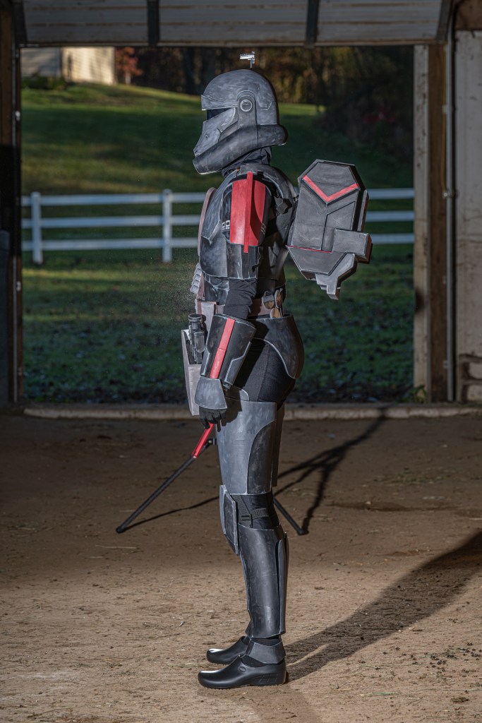 After all that, it was time to paint21. Every little thing on this cosplay is completely hand painted. The base coats even. I wanted to come as close as possible to The Clone Wars animation style as I could in the tight timeframe I had, by now it was about three weeks. I mixed up half a quart of paint for both the light and dark grey, storing it in reusable plastic paint cans22. And began painting. I started by getting everything’s base coat(s) done. After laying down the two primary grey coats, I put on the red. Once all the main colors were done and dry, I began slowly “weathering” the pieces by mixing up two lighter greys and painting them on the hard edges, layering it to be more opaque as I went to draw the eye to certain areas.
