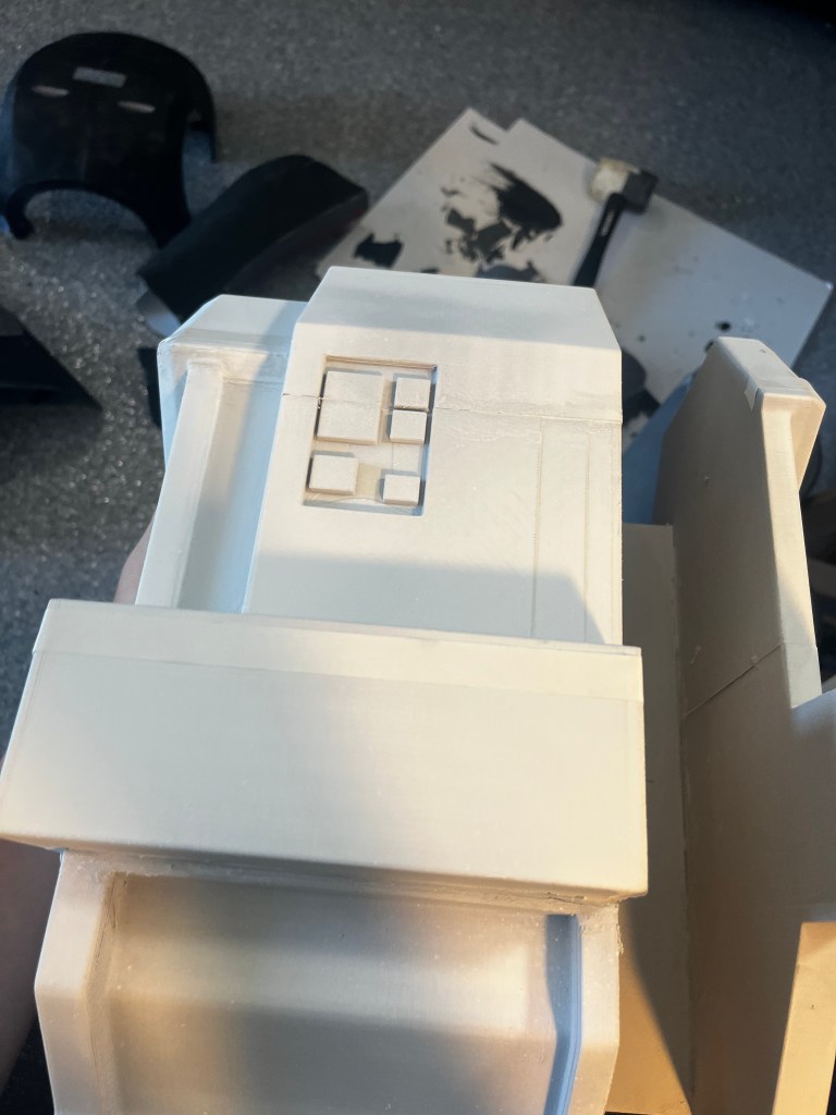 For the weapons, the pistol slides into my holster, which was heavily padded. The rifle was designed in the files to be a solid piece, with wooden dowels to support where the separated pieces adhere together. I thought it would be cool if the rifle came into two pieces, as it’s shown to do in both The Clone Wars and The Bad Batch. So after many weeks and failed attempts, I epoxy glued16 a threaded rod down the middle of the one end and a nut in the other. This worked. Except the barrel never laid flat against the chamber, every time it was screwed together or apart it made a horrifying cracking sound, and felt unstable to hold in my hands.