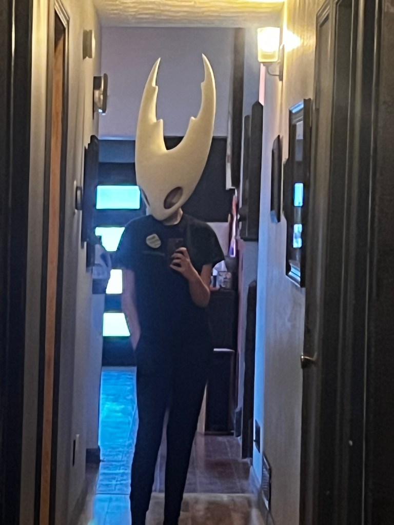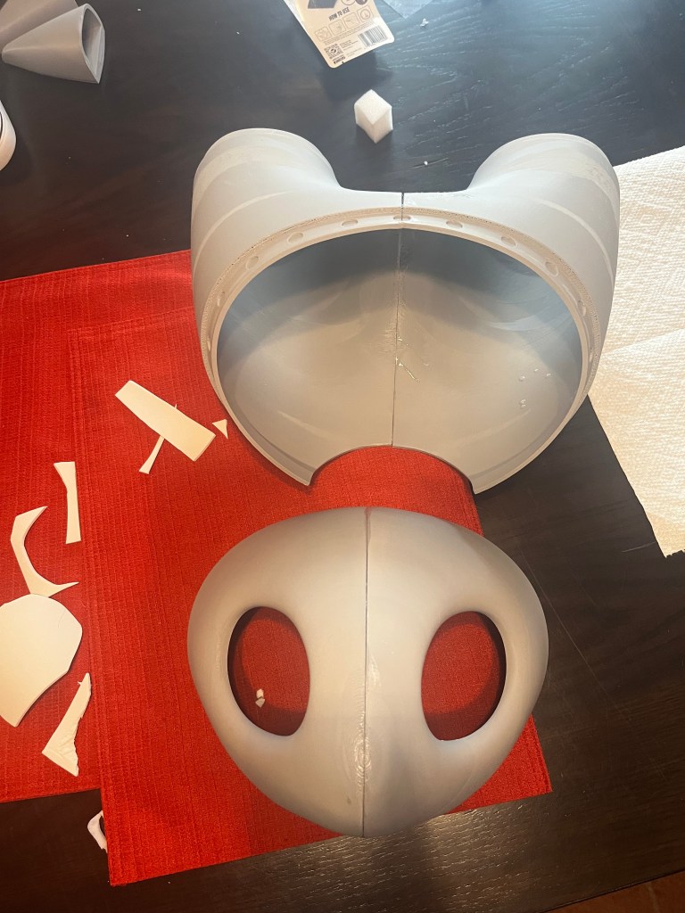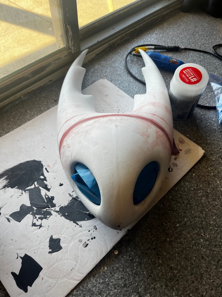 So naturally, prepping this thing was a nightmare. I tried my best to get the uneven pieces as smooth as possible using layers of bondo4 but it just wasn’t going to happen. Especially not in the timeframe I had to get this thing to Cleveland Fan Expo. So primed it with liquitex gesso5, and began hand-painting it with white acrylic paint6. This was a stylistic choice, as I personally am not a huge fan of the spray-painted hollow knight heads. I wanted texture from the brushstrokes. And it worked!