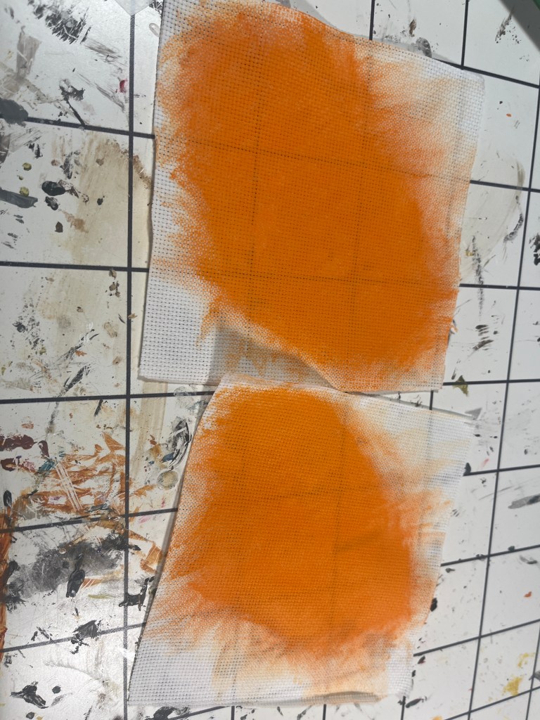 So I had to repaint the head a second time. But that only took about two days, then I painted on the crack and glued in the eyes. The eyes are made of trusty white Aida fabric8, which I dry-brushed orange acrylic paint on the front and used black paint on the inside so it’s easier to see through. Then glued them in with Loctite glue9. While I was planning to seal the head, it’s mostly white and wouldn’t be noticeable when scratched, and would have made the head shinier and thus accentuated the seams which I so greatly detest (though less than all the seams on the EVA head). Or so I thought. It did get scratched. Horribly so. So after Fan Expo I sealed it.